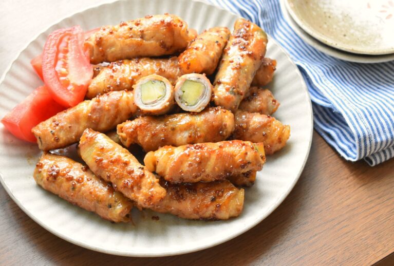 さつまいもと大葉を豚肉でくるくる巻いて、ハニーマスタードで香ばしく焼き上げました。米粉まぶすことで、しっかり巻けてタレも美味しく絡みます。