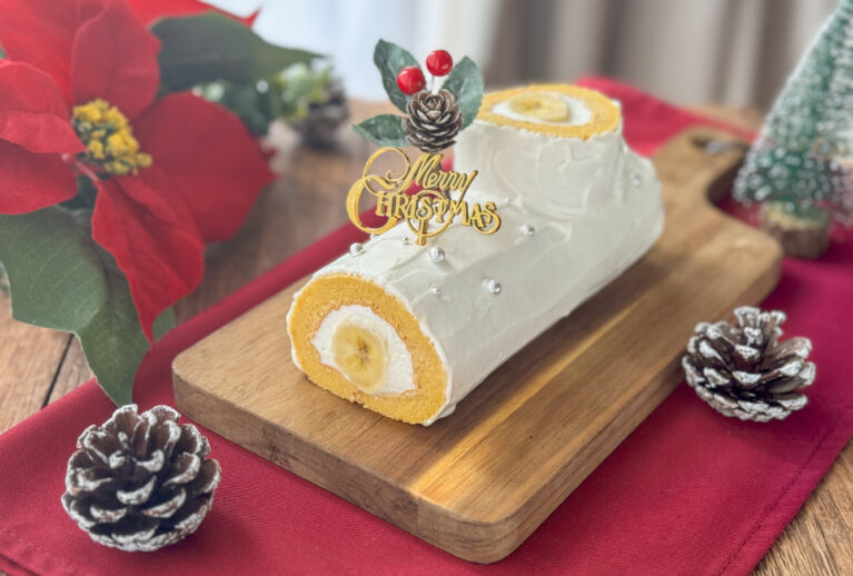 元パティシエのぺぽさん監修。米粉で作るブッシュドノエルです。ふんわりしっとりな生地に練乳クリームとバナナをまるっと巻き込みました。卵2個でつくるかわいいミニサイズのクリスマスケーキです🎄